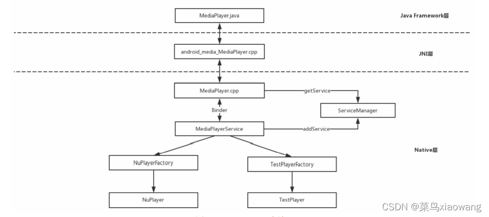 JNI是 Java Native Interface的缩写,通过JNI可以让Java方法与Native方法相互调用,其中Native方法一般是用 C/C++编写的。因此,JNI就是连接Java层和Native层的桥梁。要使用JNI需要先加载JNI库,在 MediaPlayer.java中有如下代码