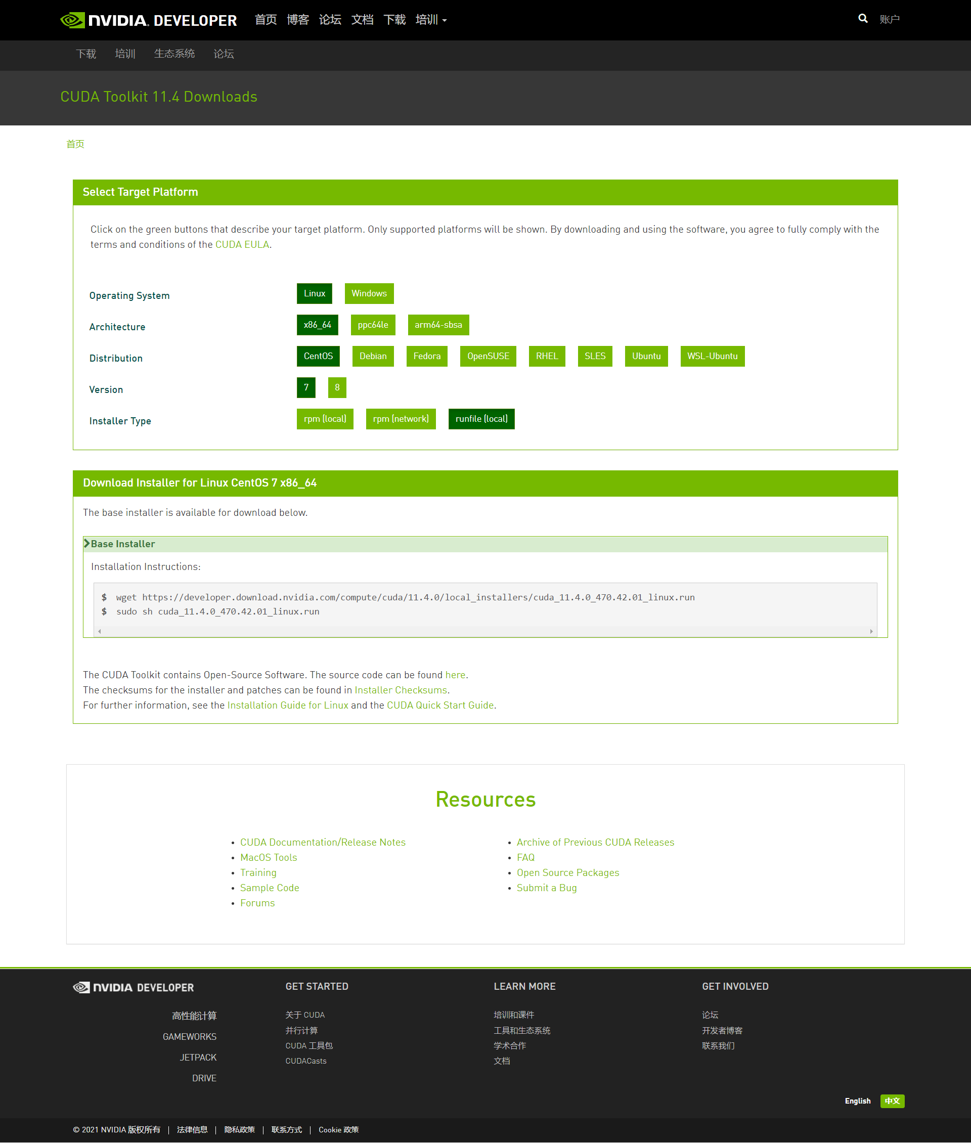 用浏览器打开 NVIDIA 开发者官网 NVIDIA 开发者 | NVIDIA Developer,点击网页最下方【常用 SDK】里的【CUDA 开发工具包/SDK】,进入 CUDA 专区。点击【立即下载】后,按下述顺序配置下载选项: