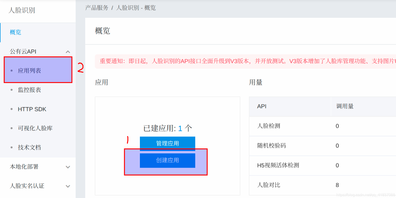 - 依次点击 个人头像---控制台总览--左上角蓝色方块下拉的人脸识别---创建应用-进入创建应用