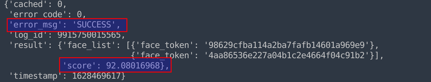 def face_recogn(self): API_url=self.get_API() #pprint(API_url) params=self.get_Param() # pprint(params) headers = {'content-type': 'application/json'} response = requests.post(API_url, json=params, headers=headers) # pprint(response.json()) score=eval(response.text)['result']['score'] if score>=60: print('二人相似度得分为 %s, 是同一人的可能性极大'%str(score)) else: print('二人相似度得分为 %s, 不是同一人的可能性极大'%str(score)) - 获得的json格式