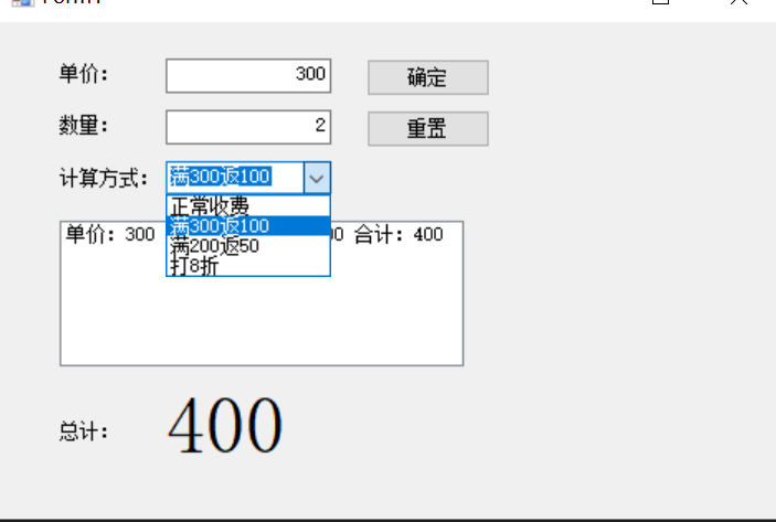 lbxList.Items.Add("单价:" + txtPrice.Text + " 数量:" + txtNum.Text + " " + cbxType.SelectedItem + " 合计:" + totalPrices.ToString());