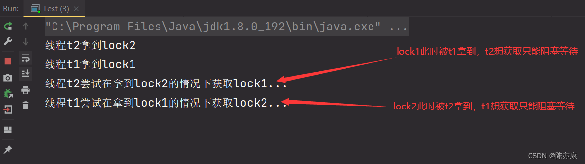 死锁就是指线程t1要使用的资源被线程t2占用,线程t2想使用的资源被线程 t1占用,这就像两股绳子拧在一起,解不开了;