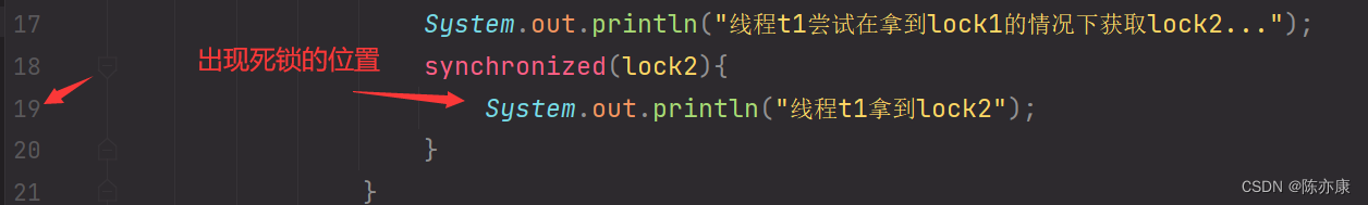 System.out.println("线程t2尝试在拿到lock1的情况下获取lock2...");