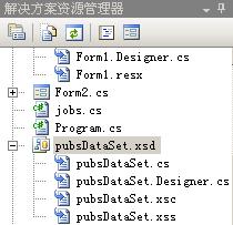 2. 设置完后在数据源窗体将添加一个dataset,在解决方案资源管理器添加一个.xsd文件。
