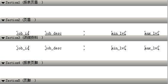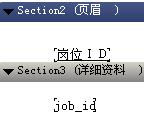 3. 把字段拖到详细资料中,可对报表进行修饰,每个报表节各有不同之处,报表页眉和报表页脚在整个报表只显示一次,可放置如表的名称、统计数据等,页眉页脚在每页报表都显示,可放表头,打印页码等,详细资料放数据内容,将字段拖到详细资料的同时页眉也会默认出现字段名,可改动,例如将job_id改为岗位id