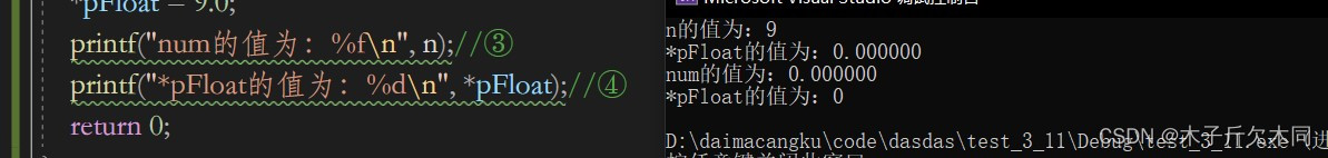 ②因为c是unsigned char,那么c = 11111111。%d又要求c由有符号的整型输出,所以c就发生了整型提升为00000000000000000000000011111111(为什么是往前面补零呢?因为c是无符号型,那么就是默认符号位也就是0,就往前面补0)。