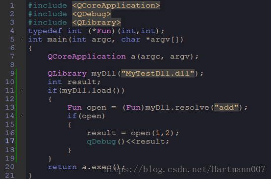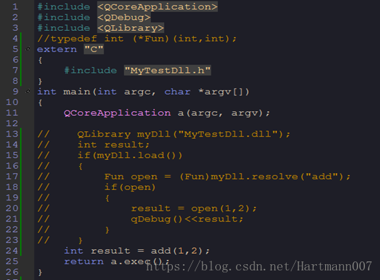 把生成的dll文件拷到Qt工程输出目录debug文件夹下,在main.cpp中引用QLibrary来实现(定义函数指针)
