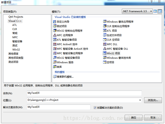 - 生成dll:这里我们利用VS2008,C++编程语言来生成dll。打开VS2008,创建->项目,选择“Win32项目”。名称可写“MyTestDll”
