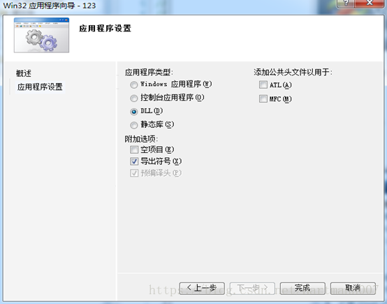 确定后点击“下一步”,然后选择Dll,附加选项中可选择“导出符号”,后点击【完成】。