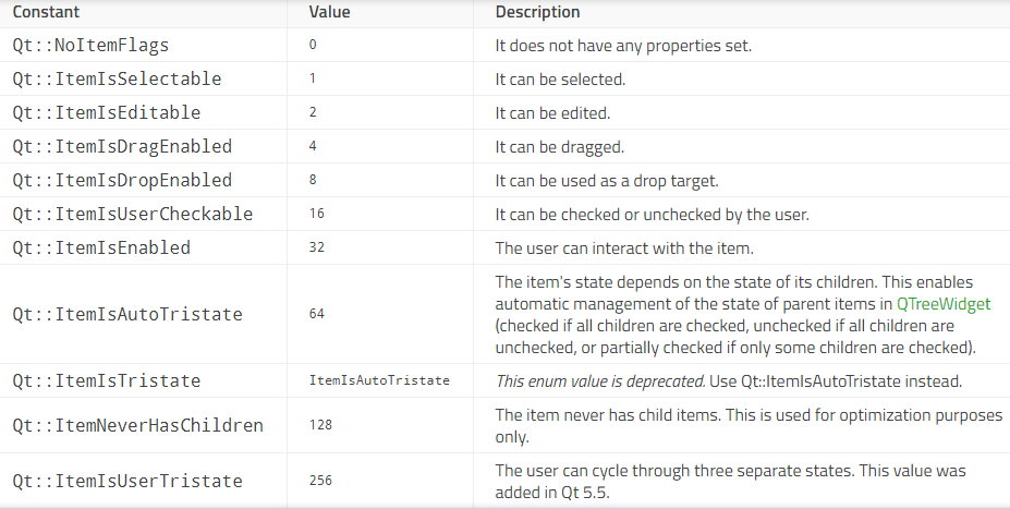 | void | setFlags(Qt::ItemFlags flags) | 设置单元格标志,可选标志如下: |