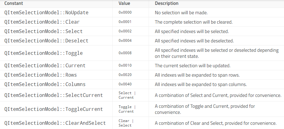 | virtual void | select(const QItemSelection &selection, QItemSelectionModel::SelectionFlags command) | 根据command选择指定的QItemSelection,command如下: |