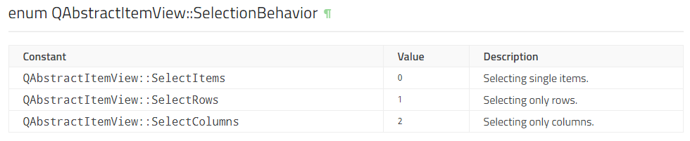 | void | setSelectionBehavior(QAbstractItemView::SelectionBehavior behavior) | 设置选择时的行为 |