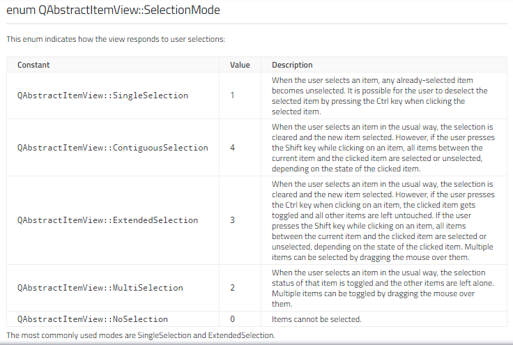 | void | setSelectionMode(QAbstractItemView::SelectionMode mode) | 设置选择模式 |