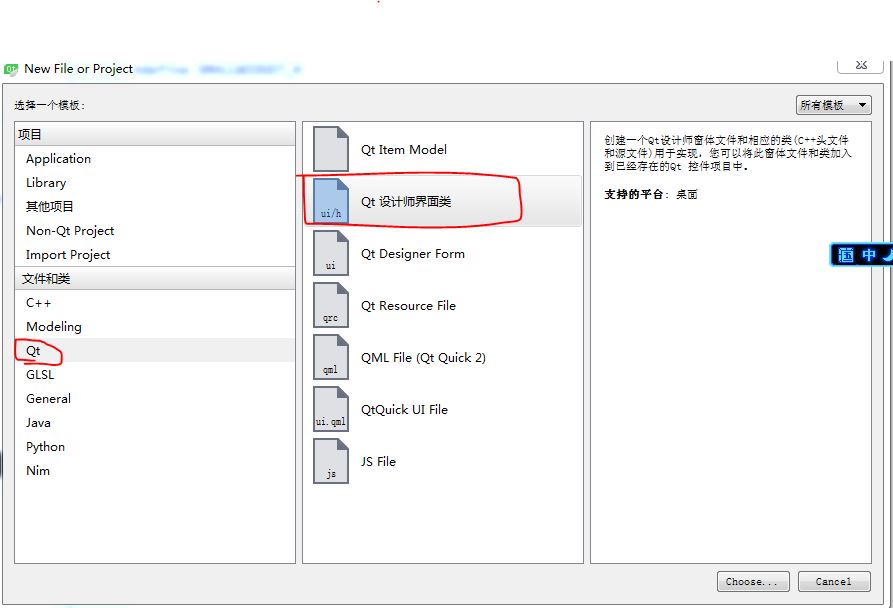 新建项目选择设计界面类后,界面模板可以选择Widget,之后的文件命名等操作按自己需求来命名。