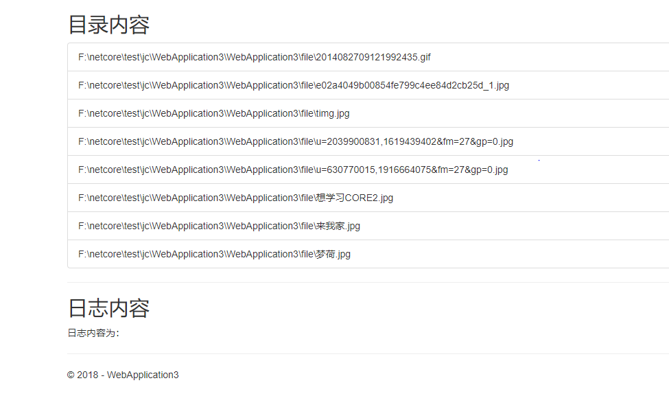 @using System.IO @{ ViewData["Title"] = "UploadFiles"; } <h2>目录内容</h2> <ul class="list-group"> //razor语法 输出file目录的文件 @{ var items = Directory.GetFiles(Directory.GetCurrentDirectory() + "\file"); foreach (var item in items) { <li class="list-group-item">@item.ToString()</li> } } </ul> <hr /> <h2>日志内容</h2> <p> @ViewBag.log </p>