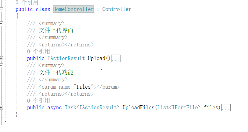 [HttpPost] //上传文件是 post 方式,这里加不加都可以 public async Task<IActionResult> UploadFiles(List<IFormFile> files) { long size = files.Sum(f => f.Length); //统计所有文件的大小 var filepath = Directory.GetCurrentDirectory() + "\file"; //存储文件的路径 ViewBag.log = "日志内容为:"; //记录日志内容 foreach (var item in files) //上传选定的文件列表 { if (item.Length > 0) //文件大小 0 才上传 { var thispath = filepath + "\" + item.FileName; //当前上传文件应存放的位置 if (System.IO.File.Exists(thispath) == true) //如果文件已经存在,跳过此文件的上传 { ViewBag.log += "rn文件已存在:" + thispath.ToString(); continue; } //上传文件 using (var stream = new FileStream(thispath, FileMode.Create)) //创建特定名称的文件流 { try { await item.CopyToAsync(stream); //上传文件 } catch (Exception ex) //上传异常处理 { ViewBag.log += "rn" + ex.ToString(); } } } } return View(); }