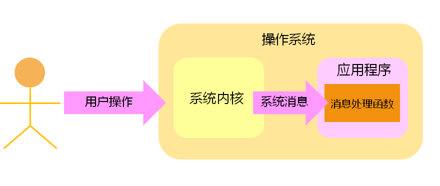 1.当用户去操作应用程序界面的时候,操作系统内核首先会感知到用户的操作,然后操作系统内核就会把用户的操作翻译成一个系统消息。