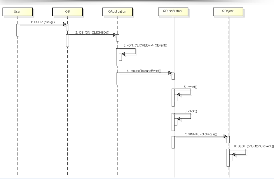 上述的第一步和第二步就是,一般GUI应用程序的大概运行原理。现在回到Qt应用程序中来,我们知道在Qt开发过程中主要是映射信号到槽函数。那么Qt中的信号是什么?Qt中的信号是由用户触发的,每当用户操作Qt应用程序的时候,就会产生信号。如果这个时候我们关联了信号与槽函数,这个时候如果我们操作Qt应用程序界面上的元素的时候,相应的槽函数就会被调用。对比的上述GUI应用程序消息处理模型原理图,我们可以知道Qt应用程序是符合GUI应用程序消息处理模型的基本原理的。然后这个时候再深入思考一下,QT应用程序也是基于操作系统的一个GUI应用程序,那么QT应用程序接受到的应该是系统消息,那么这个系统消息和QT中的信号是同一个概念吗?当然不是!