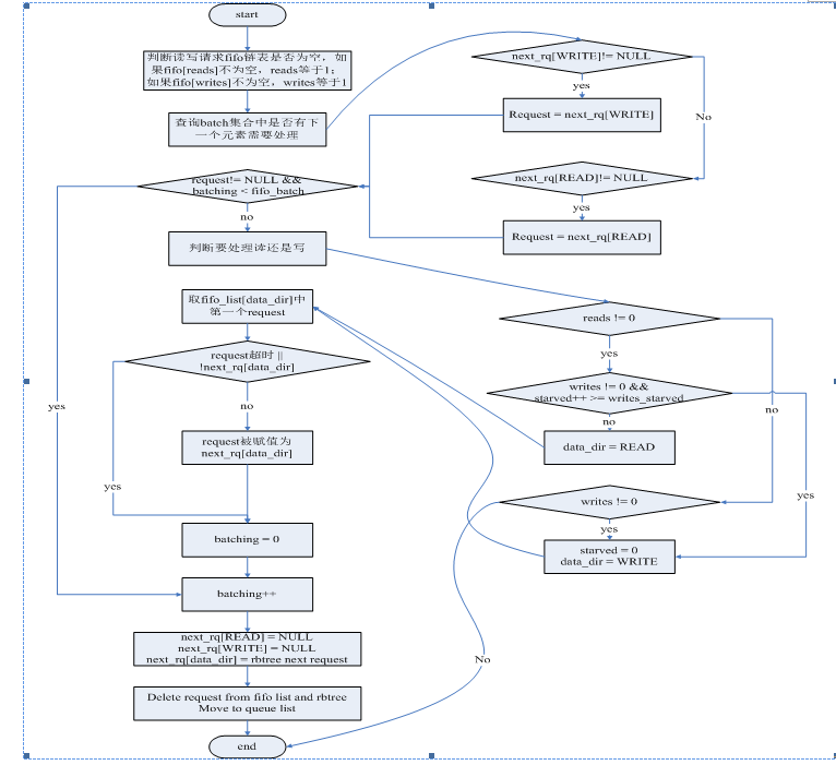 但是如果一直这样按照链表的顺序来处理,又会造成磁盘抖动的问题。所以又很灵巧的引入了一个batch的概念。它利用rbtree可以找到连续的request,这些连续的request被称为一个batch。一旦处理一个request,就会开始处理该request所在的batch,直到batch处理完毕,或者发现处理batch的个数已经超过预先设置的阈值(16)