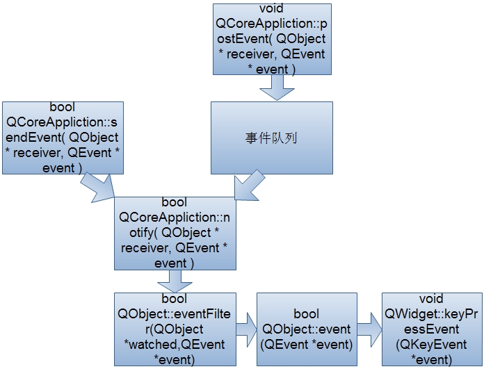 sendEvent()会把event直接发送给QCoreApplication的notify(),postEvent()把event追加到事件队列中最终也要调用notify(),notify()把事件分发给参数中的receiver,如果receiver安装了eventFilter,那么event会发给定义这个事件过滤器的监控者,如果这个event没有被过滤,那么这个event会被传给receiver的event()函数,event()函数再把这个event传给与其相应的事件处理函数(诸如keyPressEvent()之类的函数)。这些事件处理函数这才是真正响应event的函数,它们才是真正干活的,到这里算是处理完了。