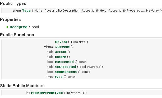 我们子类化的时候模仿一个QEvent就好了,而且是继承,好些都不用子类做了,看一下QEvent类中的成员变量和成员函数,就这些东西: