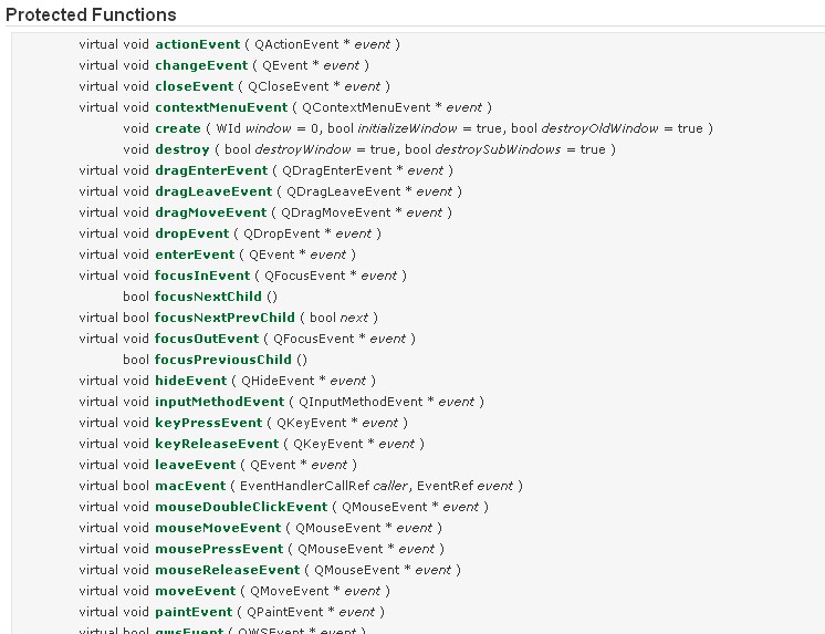 看到了吗?这些就是event handler,即事件处理函数,这是干活的那帮人。里面有我们熟悉的mousePressEvent()、keyPressEvent()等常用的事件处理函数,它们都是protected virtual 类型的,可以重载。所以呀,我们可以子类化QWidget,从而继承得到好些个event handler,当然也可以自己定义event handler!相当于自己创造士兵来响应事件。通过山寨QWidget,就可以创造自己的军队!