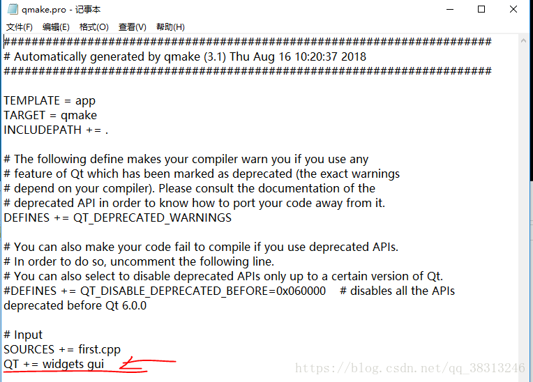 1.3.1打开生成的工程文件 最后加上QT += widgets gui