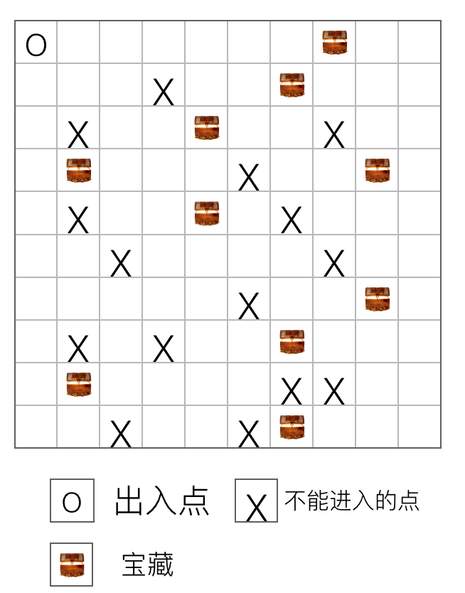 蒜头君得到一张藏宝图。藏宝图是一个 10×10 的方格地图,图上一共有 10 个宝藏。有些方格地形太凶险,不能进入。