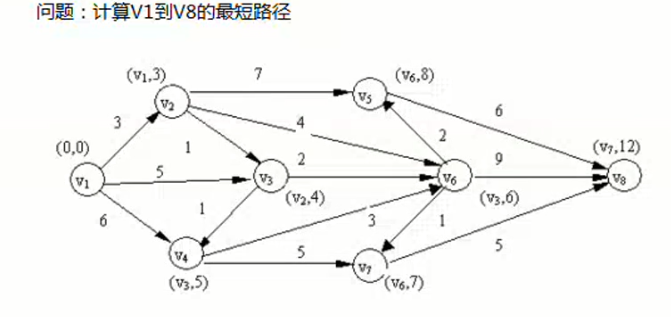 假设加权图的权代表结点间的距离,求v1到v8的最短路径。
