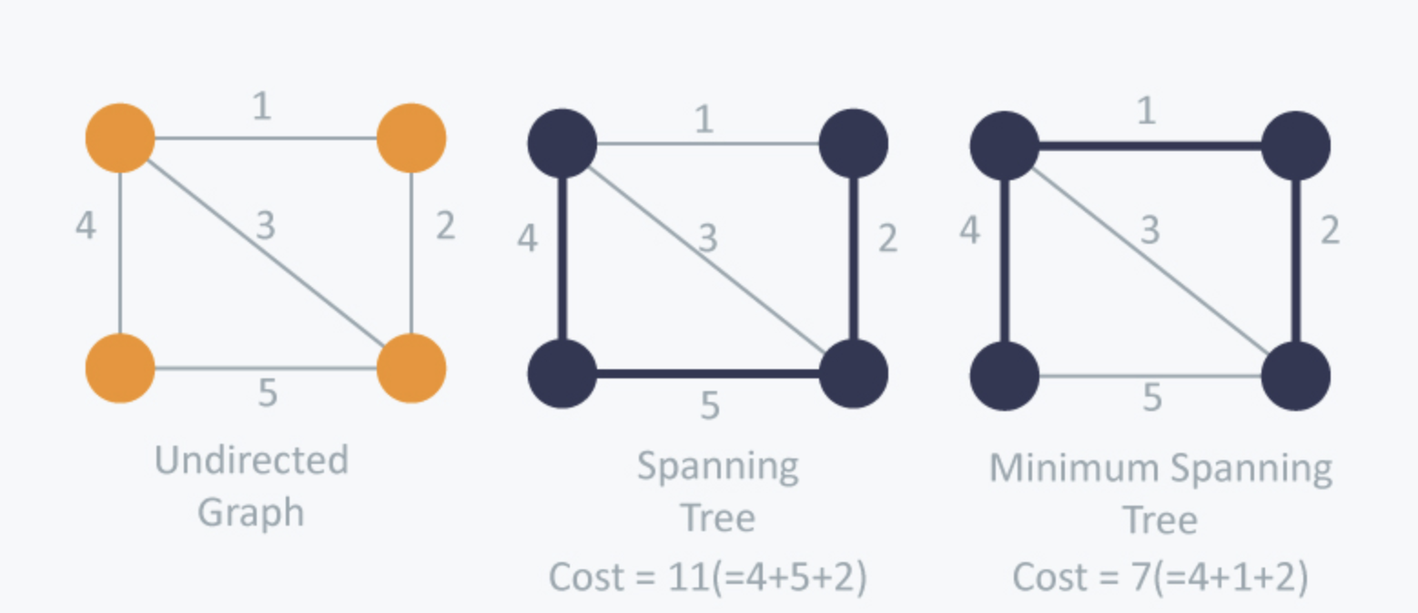 Given a connected and undirected graph, a spanning tree of that graph is a subgraph that is a tree and connects all the vertices together. A minimum spanning tree (MST) or minimum weight spanning tree for a weighted, connected, undirected graph is a spanning tree with a weight less than or equal to the weight of every other spanning tree.