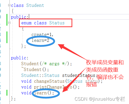 这便体现C++11引入枚举类(enum class)的重要性,enum class能够有效对枚举作用域进行限定,避免了枚举成员的重定义和枚举成员名称和外部类成员函数名称的重定义。