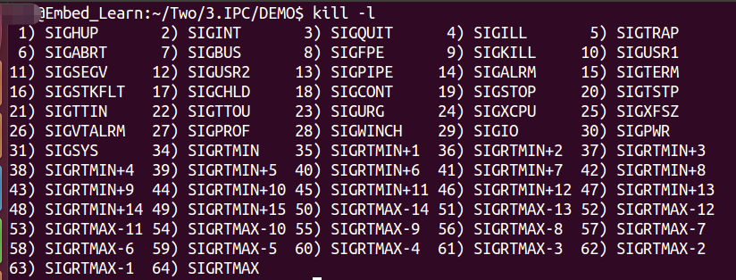 具体的信号名称可以使用kill -l来查看信号的名字以及序号,信号是从1开始编号的,不存在0号信号。kill对于信号0又特殊的应用。信号的名称