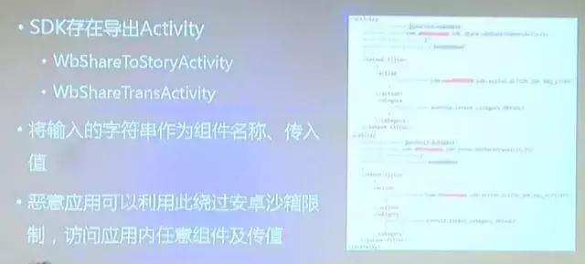 问题出在一个有分享功能的SDK上, 这个SDK存在两个暴露的组件,其中一个组件的漏洞让攻击者可以访问到应用的任意私有组件,相当于绕过了谷歌的沙箱机制