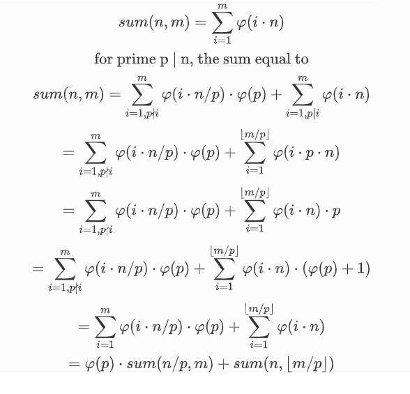 return !m?0:n==1?sum[m]:(phi[p[n]]*dfs(n/p[n],m)%mod+dfs(n,m/p[n]))%mod;