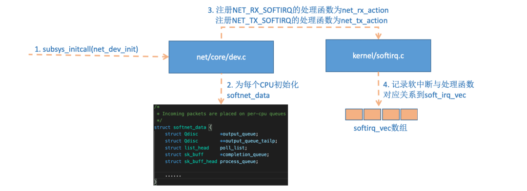 linux内核通过调用subsys_initcall来初始化各个子系统,在源代码目录里你可以grep出许多对这个函数的调用。这里我们要说的是网络子系统的初始化,会执行到net_dev_init函数。