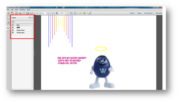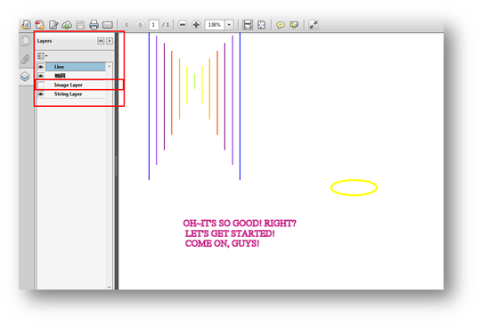using Spire.Pdf; using Spire.Pdf.Graphics; using System.Drawing; namespace AddLayers_PDF { class Program { static void Main(string[] args) { //新建PDF文档,添加一页 PdfDocument pdf = new PdfDocument(); PdfPageBase page = pdf.Pages.Add(); //添加一个线条图层,设置为可见 PdfPageLayer layer = page.PageLayers.Add("Line", true); //在页面指定位置添加指定长度的线条,并设置线条颜色、粗细等格式 layer.Graphics.DrawLine(new PdfPen(PdfBrushes.Blue, 1), new PointF(0, 0), new PointF(0, 200)); //这里可根据需要添加多条线条 //向页面添加一个名为“椭圆”的图层,设置图层为可见 layer = page.PageLayers.Add("椭圆", true); //设置图形颜色、线条粗细 PdfPen pen = new PdfPen(Color.Yellow, 2.5f); //填充图形内部颜色,并在页面指定位置添加指定大小的椭圆形图形 PdfBrush brush = new PdfSolidBrush(Color.White); layer.Graphics.DrawEllipse(pen, brush, 240, 200, 60,20); //添加一个图片图层,并命名图层为“Image Layer” layer = page.PageLayers.Add("Image Layer"); //加载图片,在页面指定位置添加该图片作为图层并设置图像的大小 layer.Graphics.DrawImage(PdfImage.FromFile("image.png"), 200, 230, 150, 185); //添加字符串类型的图层,并命名为“String Layer” layer = page.PageLayers.Add("String Layer"); //向页面指定位置绘如文本,并设置字体、字号、颜色等格式 layer.Graphics.DrawString("OH~IT'S SO GOOD! RIGHT? n LET'S GET STARTED!n COME ON, GUYS!", new PdfFont(PdfFontFamily.TimesRoman, 12), new PdfPen(PdfBrushes.MediumVioletRed, 1), 45, 250); //保存并打开文档 pdf.SaveToFile("AddLayers.pdf", FileFormat.PDF); System.Diagnostics.Process.Start("AddLayers.pdf"); } } }