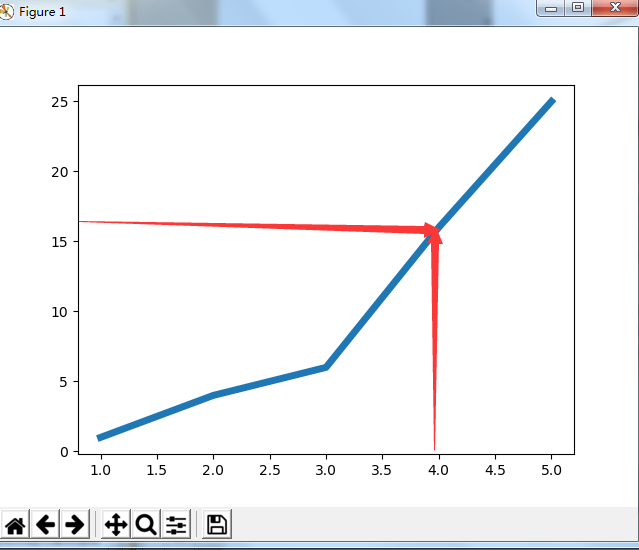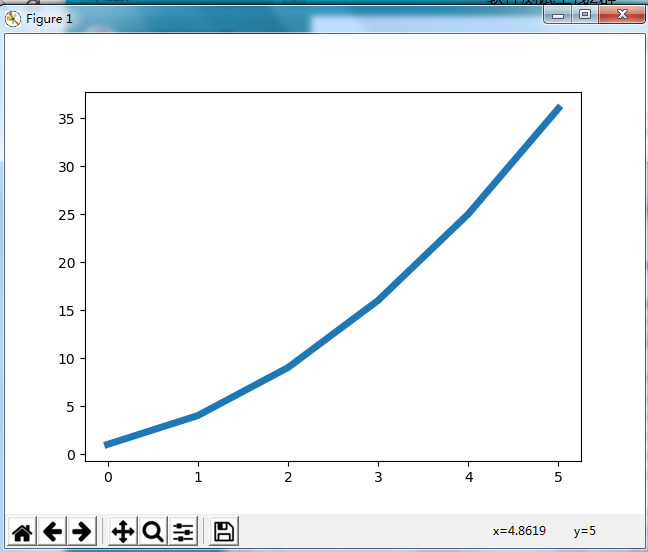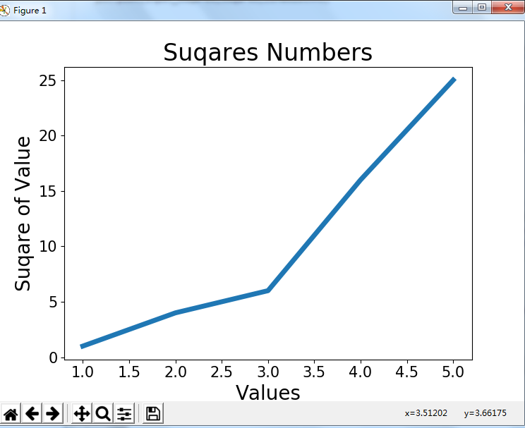 运行结果如下:细心地朋友应该发现这个图形绘制的是错误的,因为在x=4时,y=25。并非我们期望值16,这是因为当你想plot()提供一系列数字时,它假设的第一个数据点对应的x坐标轴为0,但我们给的第一个x坐标轴值为1。为了避免这个问题。我们可以给plot()同事提供输入值和输出值,这样就可以避免出现相似的错误。下面是更待后的代码。
