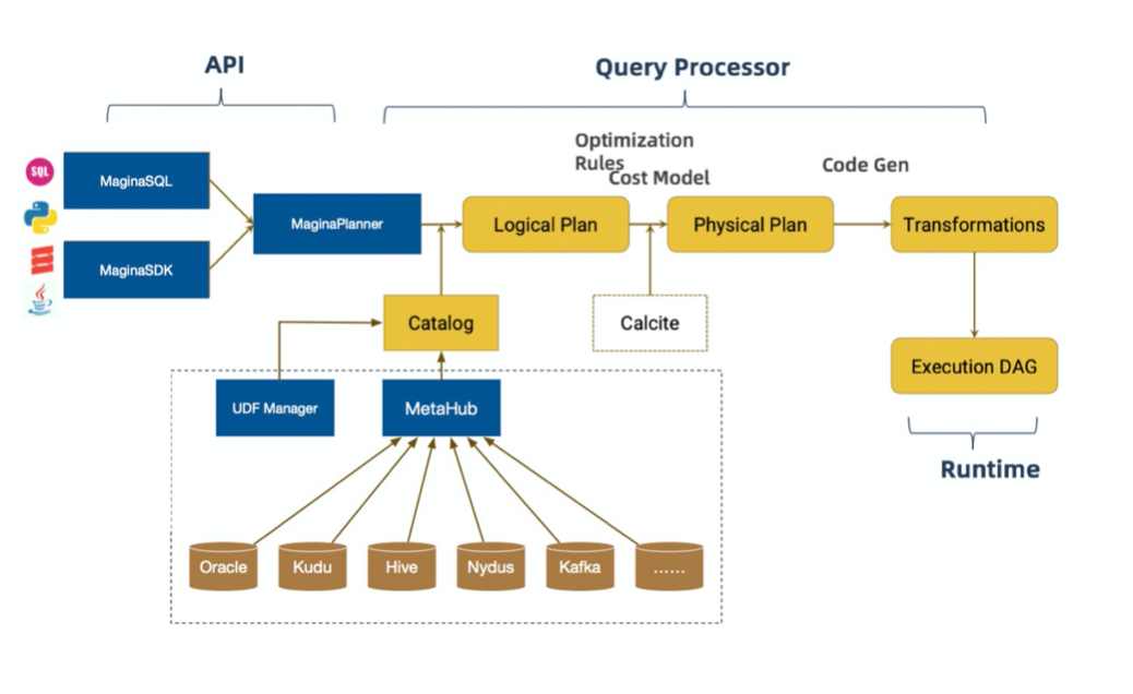 从最源头开始看实时数仓的架构图,SQL和SDK作为输入,直接去走Planner。Planner和SQL打通,可以解析整体的SQL语句。接下来,会有一个Catalog的注入,它接的是MetaHub(云数据中心)。