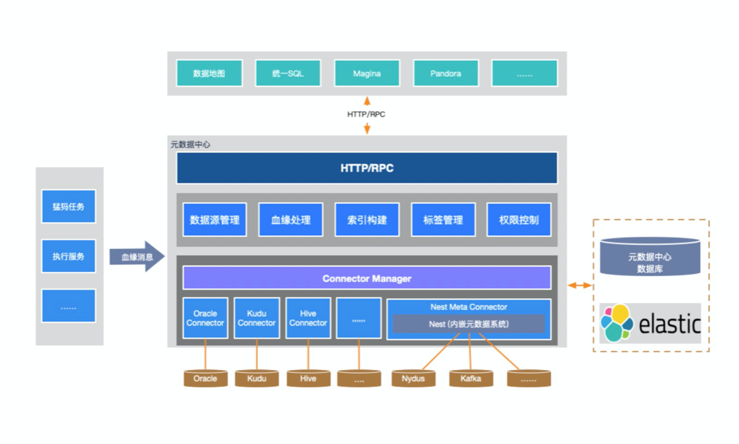 所有的元数据都被管控起来,就形成了一个系统,也就是元数据中心。它可以管理所有存在元数据系统的存储,并具备独立模块管理MQ元数据、插拔式元数据管理、统一数据类型、元数据检索等功能。