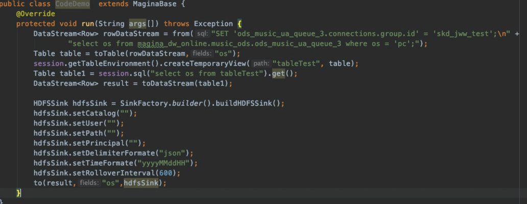 SDK提供封装内部SQL执行逻辑,简易的API,以及数据血缘收集。上图是用SDK做的一个DEMO,这是真实的一个业务代码。之前是用了将近190多行代码去实现的,在封装之后总体不过十几行代码,方便用户使用。