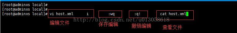 在接下来就是如何编辑文件和查看文件了,假如现在local目录下存在host.xml文件,我们需要编辑或者查看它。查看的命令是cat host.xml;编辑的命令是vi host.xml,然后按下i,进入修改模式,要不然就只是看,如果我们突然不想修改时,按下ESC 然后在命令行中写下 :q! 然后回车就接触编辑,如果我们是编辑完了需要保存,也需要按下ESC,然后输入 :wq 回车。