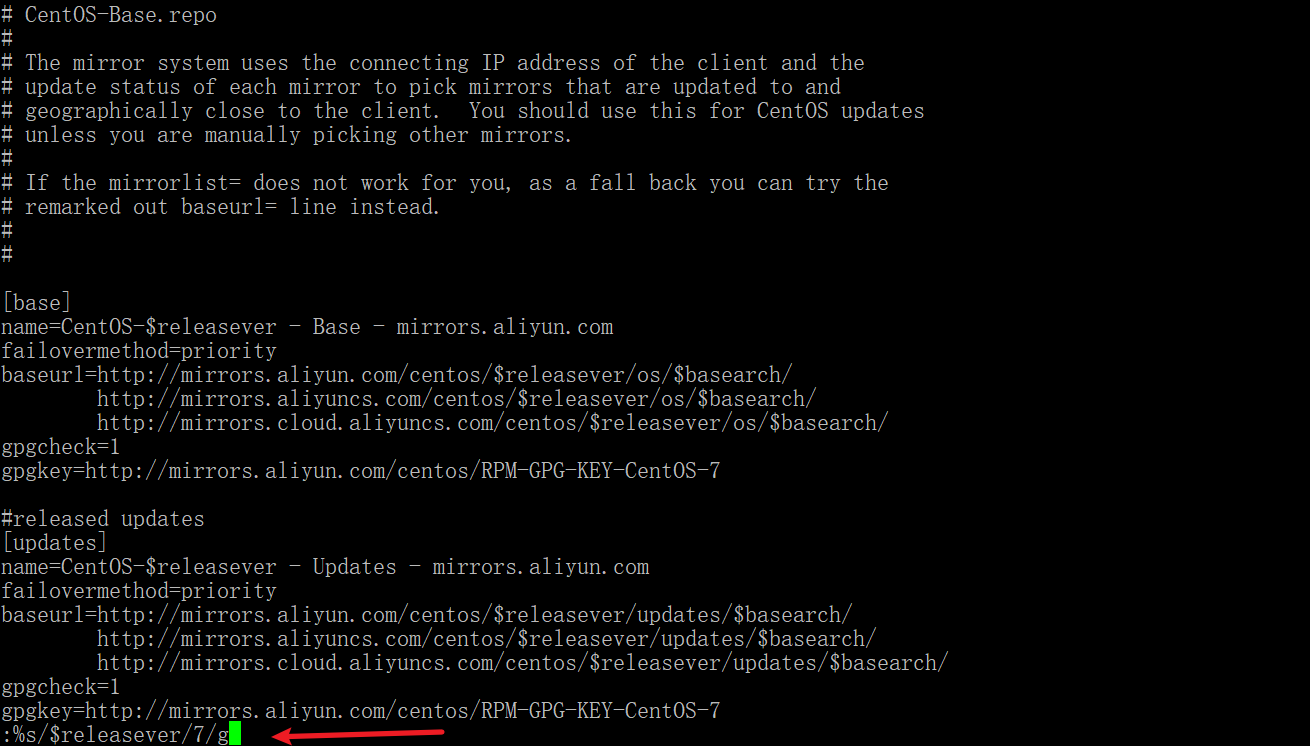 6.按键盘点击 : ←这个符号(需要shift键加冒号键) 然后输入 %s/$releasever/7/g 回车 (g结尾,配合%s 意思是替换所有)