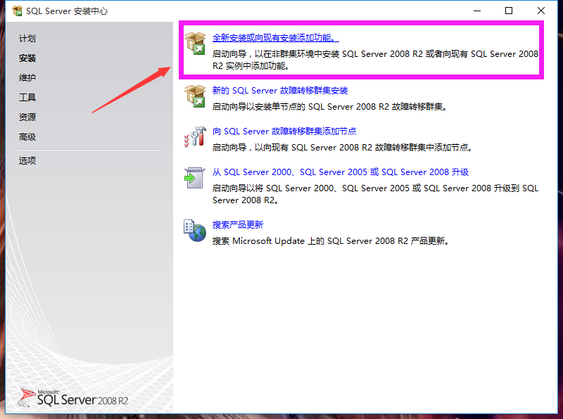 5、点击“全新安装或想现有安装添加功能”,如下图: