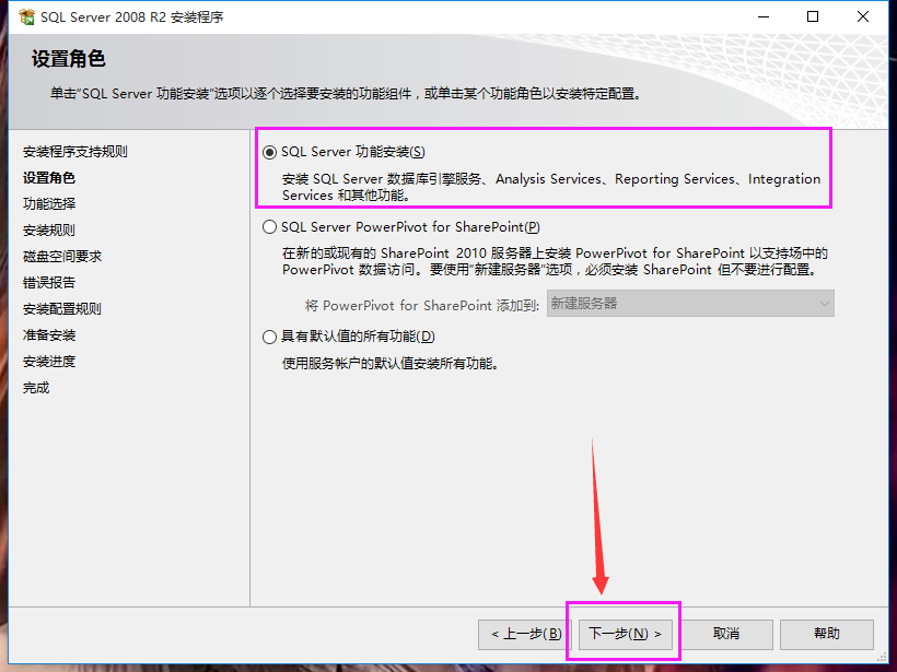 14、设置角色界面选择“SQL Server 功能安装”,点击“下一步”,如下图: