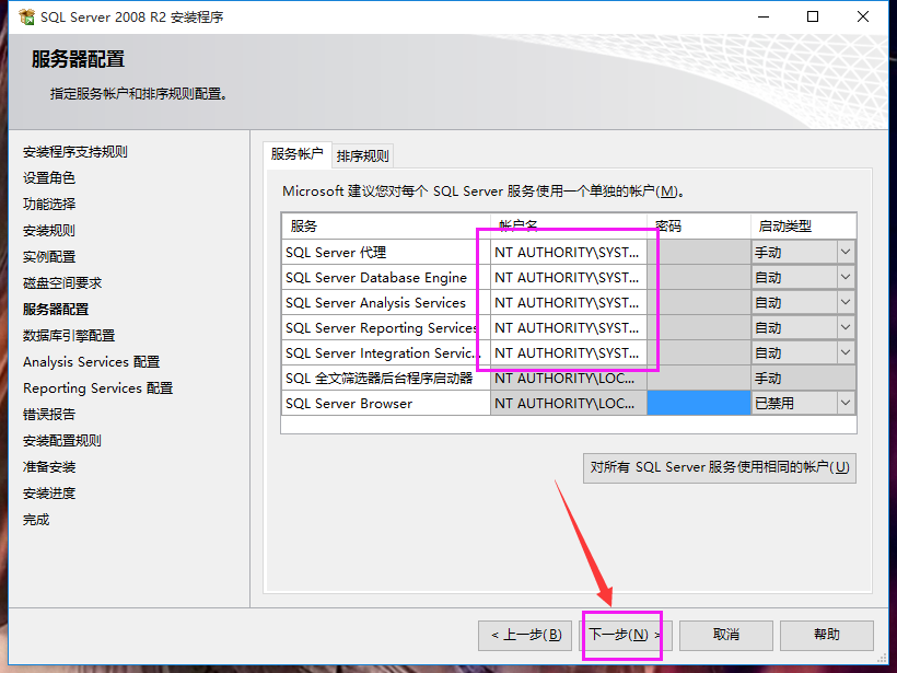 19、服务器配置界面,前五项空白账户名需要填写。点击输入框,右侧下拉框中根据情况进行选择。本文统一选择“NT AUTHORITYSYSTEM”,如下图: