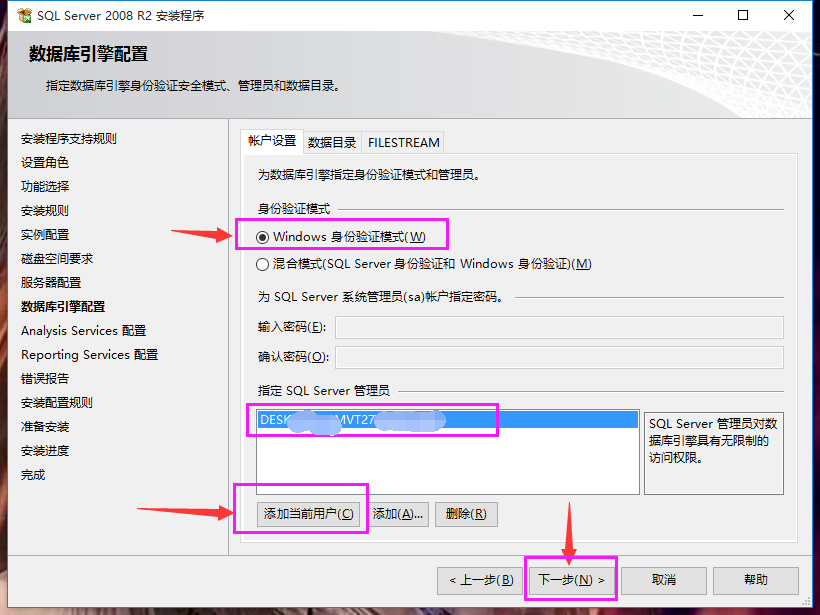 21、数据库引擎配置界面,选择“Windows身份验证模式”,然后点击“添加当前用户”,添加一条账户信息,点击“下一步”,如下图: