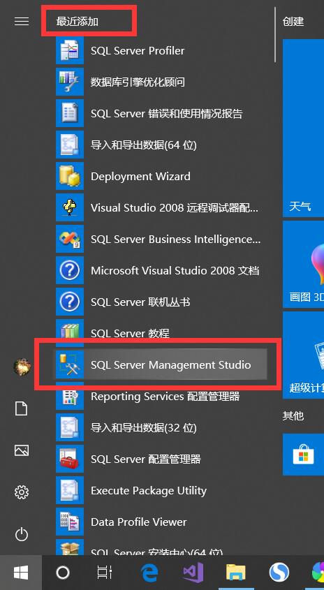 1、点击“开始”—“最近添加”界面,找到“SQL Server Management Studio”: