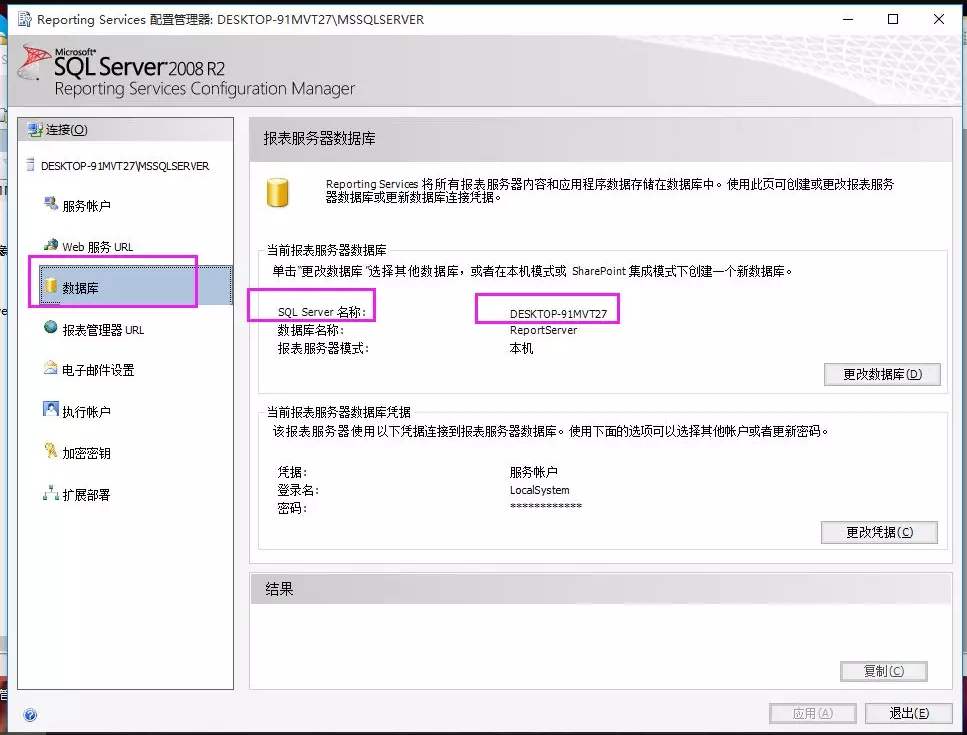 5、在“数据库”界面即可看到SQL服务器名称,默认情况下为计算机名称,如下图。记住或者复制此名称:
