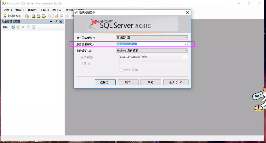 4、默认情况下服务器名称为计算机名,自动加载,点击“连接”即可。