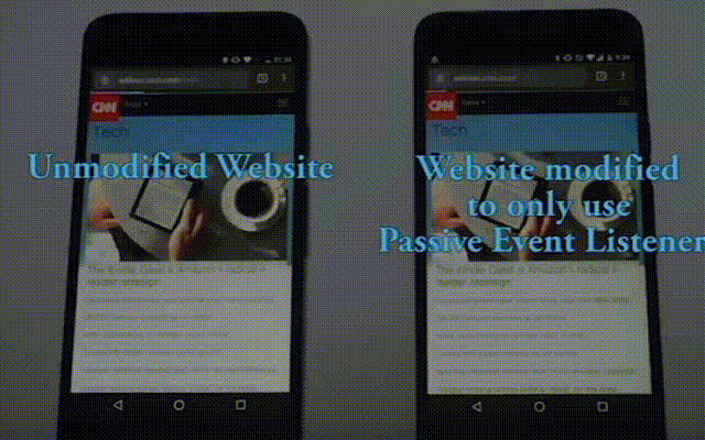 Passive Event Listeners特性是为了提高页面的滑动流畅度而设计的,页面滑动流畅度的提升,直接影响到用户对这个页面最直观的感受。这个不难理解,想象一下你想要滑动某个页面浏览内容,当你用鼠标滚轮或者用手指触摸屏幕上下滑动的时候,页面并没有按你的预期进行滚动,此时你内心往往会感觉到一丝不爽,甚至想放弃该页面。Facebook之前做了一项试验,他们将页面滑动的响应刷新率从60FPS降低到30FPS的时候,发现用户的参与度急速下降。